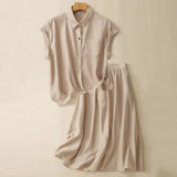 Buddha Stones 2Pcs Shirt Top 7-8 Length Skirt With Pockets Cotton Linen Clothing Women's Set
