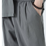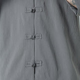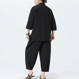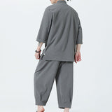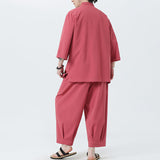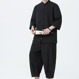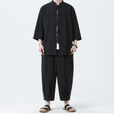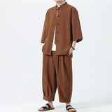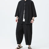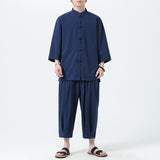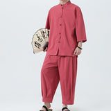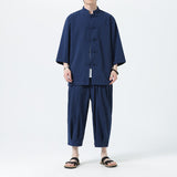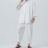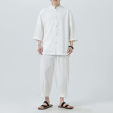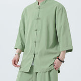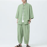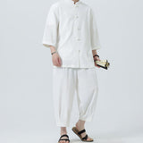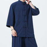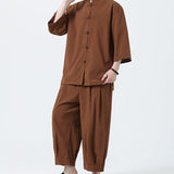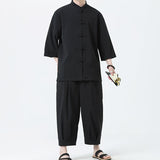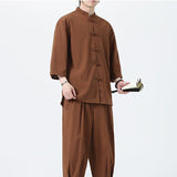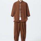 Buddha Stones 2Pcs Solid Frog-Button Three Quarter Sleeve Shirt Pants Men's Set